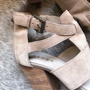 Hinge tan genuine suede block heel open toe sandal w ankle details zip back 6