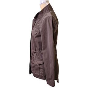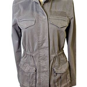 Armpit to armpit is 18 inches and the length in front is 26 inches and the length in back is 28 inches. Cinched waist. 5 front pockets. Made of cotton/spandex. Very good preowned condition.