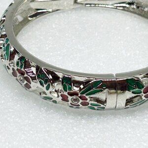 Hinged Bangle Bracelet w Green & Red Enamel Floral Accents & Clear Crystals
