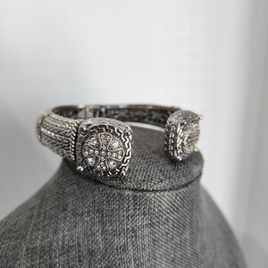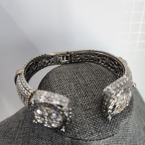 Bold and beautifully detailed, this hinged silver tone bracelet features a textured woven-style band with ornate crystal-studded end caps. The floral medallion motif on each end sparkles with clear rhinestones set in intricate filigree-style bezels, giving it a look that’s both elegant and substantial.