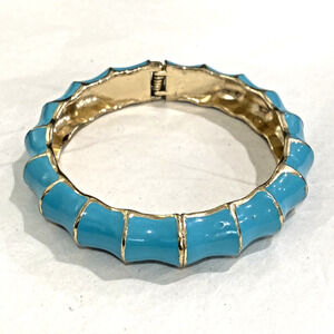 Hinged clamper style bracelet turquoise blue enamel on shapely goldtone - fashion jewelry bangle - no hallmarks - One Size will fit most. Nice quality with stunning color - in excellent condition - minimal wear - no damage or flaws.