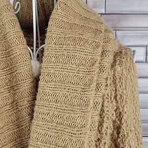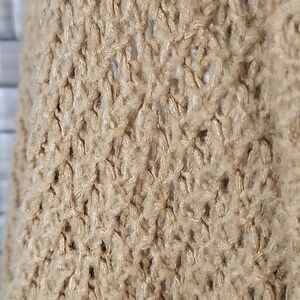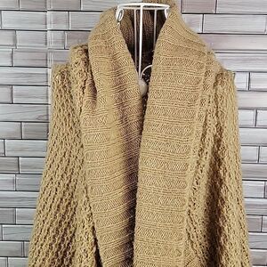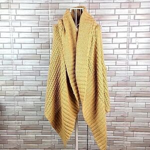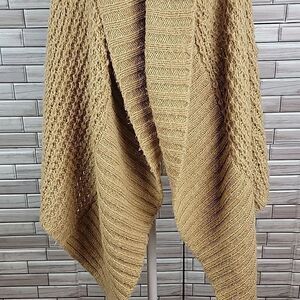 Acrylic nylon blend large knit sleeveless cardigan with a large shawl front in a hi lo styling. This is an extra small but really an oversized sweater. I usually wear a small and it fits me fine. Good pre-owned condition.