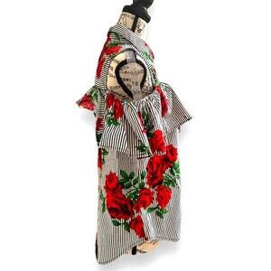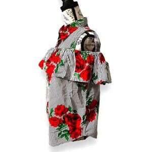 Description: Chic and romantic, this Hint of Blush cold-shoulder blouse features bold red roses, classic black-and-white stripes, and a soft ruffle detail. Perfect for date nights, brunches, or dressing up denim with ease.