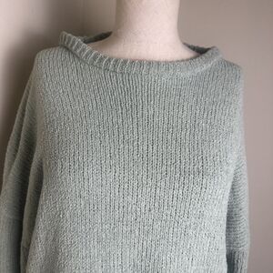 This is a green Hint of Mint sweater and it is a size XL. The sweater has a crew neckline and long sleeves. The knit is made of polyester chenille and it is lightweight. The sweater is a pullover and has wrist ties. This sweater is perfect for spring because it is lightweight and comfortable.