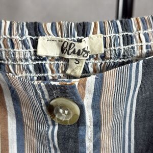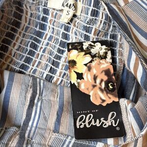 NWT Blue, brown and white straps. Smocked in the back. Bust: 34” Length: 31”