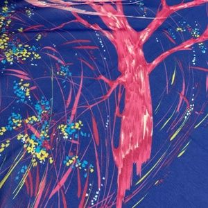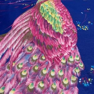 Hip scarf for summer. Colorful large scarf/shawl featuring a big peacock in soft pastel color of pink on blue foundation. Could be worn around shoulders or as a hip scarf.