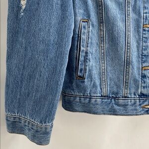 Stylish distressed blue denim jacket with button closure and front pockets.