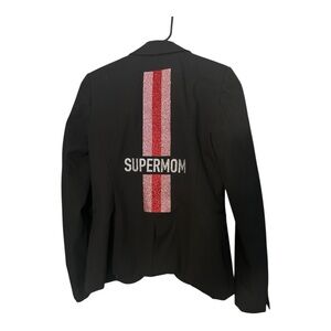Stand out in this bold and rare HIPCHIK COUTURE “SUPERMOM” Blazer – a chic statement piece designed to turn heads. This black blazer features striking red stripes and edgy details that elevate any look, whether you’re dressing it up or keeping it casual.