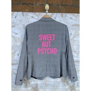 Make a statement with this Hipchik Couture "Sweet But Psycho" plaid blazer, size 12. As seen on Margaret Josephs of The Real Housewives of New Jersey, this unique blazer features a bold "Sweet But Psycho" graphic on the back. This Hipchik Couture blazer includes one-button styling, a notch lapel, and is lined with 100% polyester. It's perfect for business, casual outings, or adding a touch of personality to your workwear.