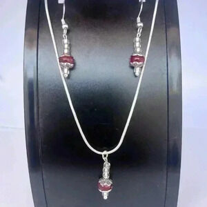This is a handcrafted, beautifully beaded charm on an 18-inch silver necklace fit with a lobster claw and accompanied by a matching pair of 925 stamped dangle hook earrings fit with rubber backings. Made in Key Largo, Florida.