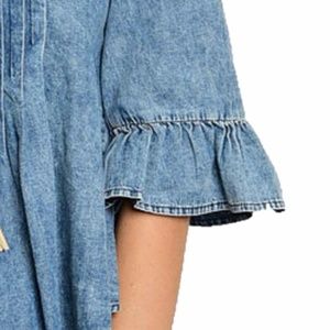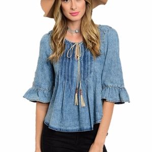 We love the Boho Hippie Denim Top, minor washed denim, beautiful Ruffle 3/4 Sleeve, Center pleated, Aztec leather tassel tie at center, Minor flares, all season, Soft Cotton with Breezy comfort, quality made; SO SO SO Boho, SO in trend now, it will never go out of the style, Dress up or down easily and effortlessly, With a pair of jean / shorts and boots to complete the look... Simple... and we JUST LOVE IT....