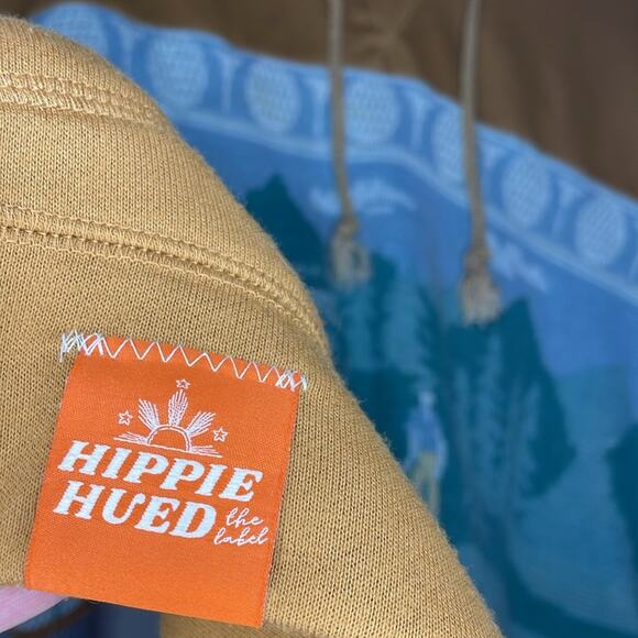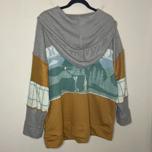 Handcrafted and one-of-a-kind! ๐ This cozy Hippie Hued rework hoodie features mixed fabrics and patchwork design with a moon phase forest mountain scene across the chest ๐ฒ๐ Earthy tones in mustard, blue, sage green, and gray create a cozy, vintage-inspired aesthetic. Contrast plaid sleeves, ribbed cuffs, drawstring hood, and front pouch pocket add extra charm and comfort โจ Unisex fit, likely best for size Medium/Large depending on desired fit.