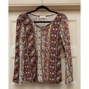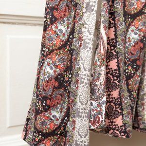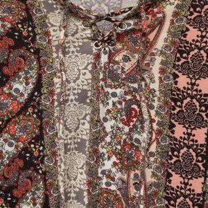 Multiple patterns- paisley, boho, floral. String tie at neckline. Bell sleeves.