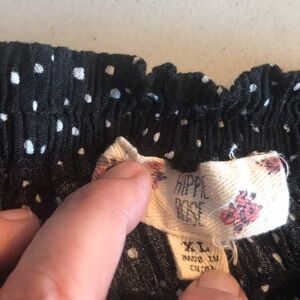 Pre-loved great condition Hippie Rose black with white dots and tie at waist short sleeve top size XL. Stretchy necks and sleeves. Faux buttons on front of shirt.