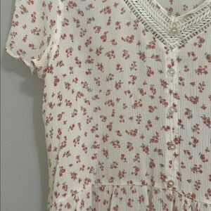 Chic cream top featuring subtle pink and yellow patterns. Lightweight and stylish.