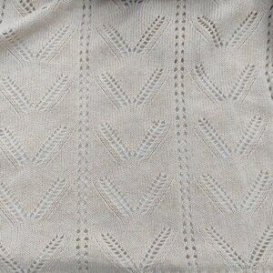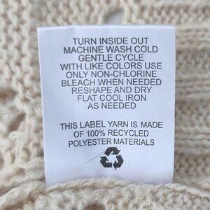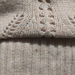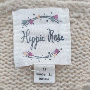 This is a long cardigan sweater from Hippie Rose. It is cream or tan. The knit has some areas with wide-knit in a pattern, and it has two pockets. It is a size small. For measurements, the shoulders are 23.5 inches, the chest and shoulders and waist are 37, it is 32.5 inches long, and the sleeves are 20.5 inches. It is 67% polyester and 33% acrylic and is machine washable. It is in excellent, just showing very minor signs of wear. The yearn is multicolor. I do find that there are a few areas with color variation that can trick eye into thinking there is a stain (pictured), but there are no stains.