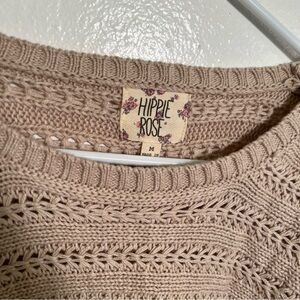 Great condition. Hippie Rose. Crewneck sweater. Dolman sleeve. Loose knit. Beige color. Size medium. 60% cotton, 40% acrylic. Pit to pit laying flat 20” Shoulder to hem 20” Sleeve (shoulder seam to hem) 27”. All measurements are approximate and taken lying flat. Smoke free home. No trades, offers welcome.