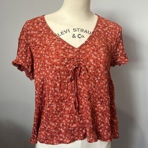 Embrace a chic look with this floral rust V-neck top. Perfect for casual outings, this top offers comfort and style. The delicate floral pattern adds a touch of elegance.