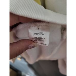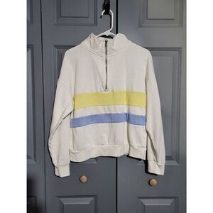 Hippie Rose white half-zip pullover, 1 wide yellow stripe under bust, 1 wide baby blue stripe under yellow stripe, size L, 53% cotton 47% polyester, slight untreated stain on right cuff (see pics), great condition.