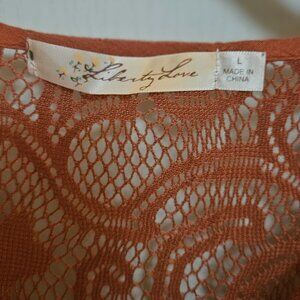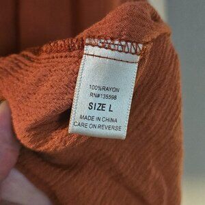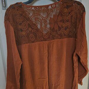 Embroidered lace yoke, gauze body. Terracotta color. 90's vintage. Has some loose threads at the collar. See pictures for measurements. Sleeve length hits at forearm.