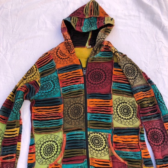 Brand new hippie jacket from Nepal. It’s like medium size/ can fit large if you wear tight jacket