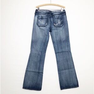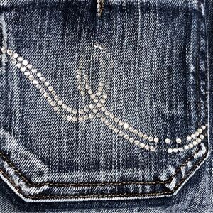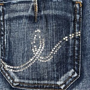 Good condition gently preowned just a few rhinestones missing on the back pocket and at the waist as shown in images.