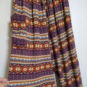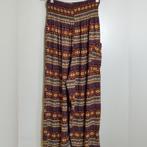 Embrace a bohemian vibe with these stylish patterned harem pants. Perfect for casual outings or relaxed days at home. 100% rayon fabric, smocked waistband, side patch pockets and elastic ankle hem. Great pre-owned condition with no flaws noted.