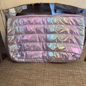This bag features a mesmerizing iridescent metallic sheen in a soft pastel purple, adding a touch of glamour and elegance to your beauty routine.The quilted puffer material not only looks chic but also provides durability and protection for your belongings, ensuring your items stay safe and stylish.