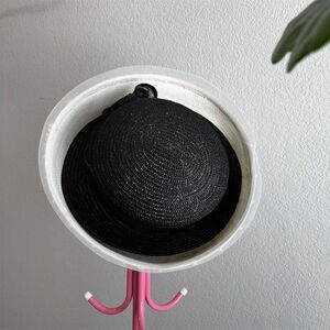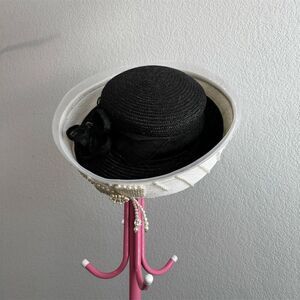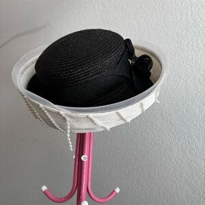 This wide brim hat from Hi's Classic is designed for women and is perfect for weddings. It features a multicolor design with pearl accents and is made from polypropylene. The hat is one size fits all and is manufactured in Taiwan. The condition is good but with flaws.