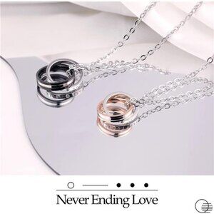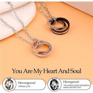 *CUSTOMIZED COUPLE NECKLACES: Smaller silver rings are engraved with 'ETERNAL LOVE,' while the larger rings feature the heartfelt message 'THE WORLD LOOKS WONDERFUL WHEN I AM WITH YOU,' all adorned with shimmering crystals. Express your love to your better half on Valentine's Day or your anniversary.