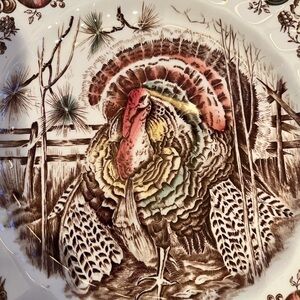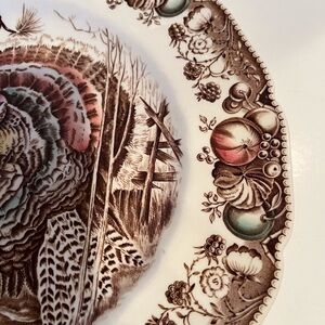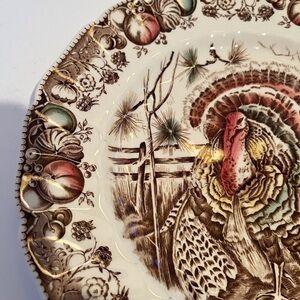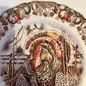 English vintage Thanksgiving, transferware dinner plate. Diameter 10.5in. An iconic English china pattern, features a regal Tom Turkey spreading his plumage, with a border of fruit, nuts, berries and leaves. The colors are lush earth tones and are in excellent condition, clear, vibrant and bright. There are no chips or cracks.