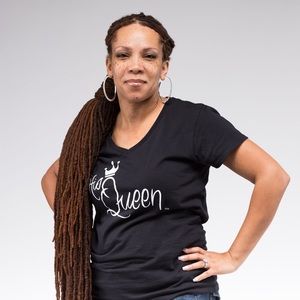 Black V neck shirt with White Letters. Also available in Med-3XL.