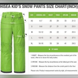 Water & Wind Resistant : HISEA's pants with a high level of water & wind resistance and breathability, WP/WR 3000mm & MP 3000g/㎡/24h-Water resistant/breathable grade. It is an excellent equipment for children's winter activities, hiking or other outdoor sports.
