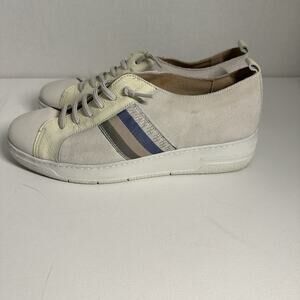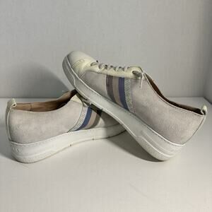 Neutral suede + soft leather combo Striped Euro-style casual comfort sneakers by Hispanitas Size 40 (fits US 9.5) — made in Spain floral insole, perfect for spring streetwear. Pre-owned- This item has been gently worn and is in nice condition. - TWIST TESTED. Minor wash wear consistent with age. Refer to images for condition. Due to light and screen difference, the color may be slightly different from the picture.