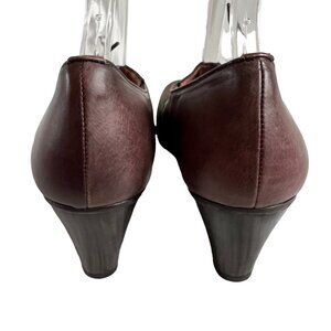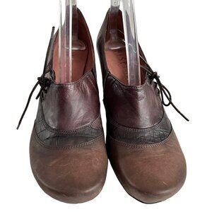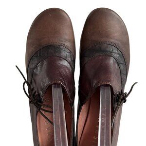 Hispanitas high heel shoes, multi toned brown leather with croc embossed leather, round toe, asymmetrical lace up, 2.75" high block heel, EU 41 / US 10.5, preowned and shows wear on the soles, scuffs - see photos
