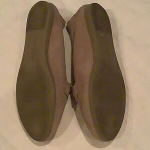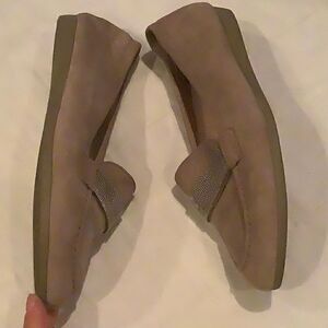 Beige suede loafers with silver detail strap over toes soft flexible footbed easy on off loafer for casual comfort that looks classic and put together.