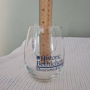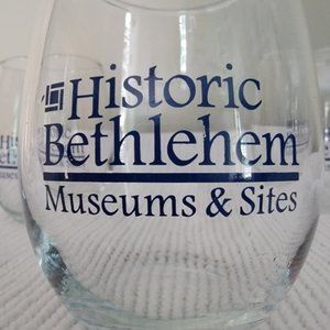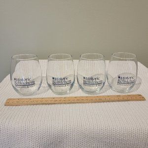 Set of 4 stemless wine glasses with "Historic Bethlehem Museums & Sites" logo. Diameter approx. 2". Height approx. 3 1/2". Total capacity approx. 8 fluid oz. Excellent pre-owned condition. Please see photos. The ohotos are part if the description. Dishwasher safe. Great for causal entertaining.