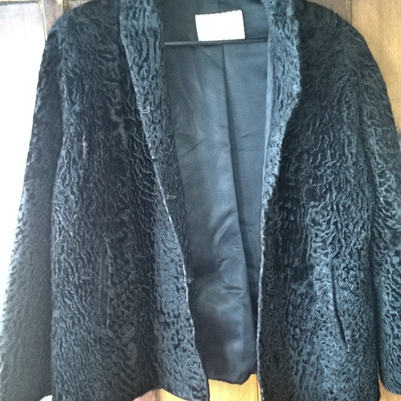 I bought this vintage lambs wool coat from a woman in Portland, Oregon who officially married her house. I had it appraise once many years ago and because of its history they estimated the value of $150. Since this is an old vintage piece the fur shows wear, especially on the edges. The lining is in good condition, the coat still has life left. Fits a large to extra large.