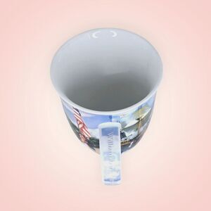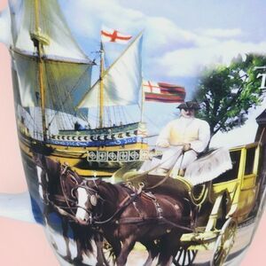 This vintage coffee mug is a must-have for any collector of American-themed memorabilia. The round, medium-sized mug features a colorful painted design showcasing the historic triangle of Williamsburg, Jamestown, and Yorktown. It's perfect for enjoying hot or cold beverages and comes with a handle for easy gripping.