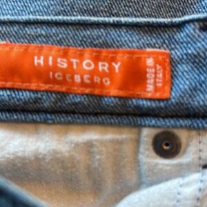 History Iceberg - Y2K made in Italy patchwork denim blue jean capris with PePe Le Pew embroidered on left front hip area heart of rhinestones *** with 7 missing see picture- HISTORY ICEBERG is embroidered under right back pocket - otherwise in good pre owned condition - size 27