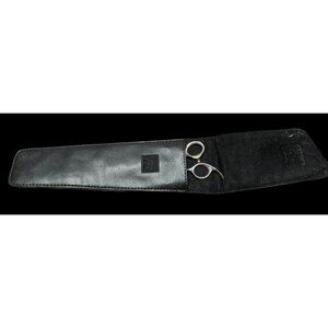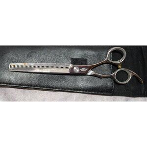It's a pair of thinning shears for hair cutting by Hitachi. They have a flat side, and a toothed side for easy thinning. They've been gently used and have no major scratches or damage, but there is a but of rust on the end of the toothed side. See photos for pictures of rusting. They come in a leather protective case, with Velcro closure, and plush inside.