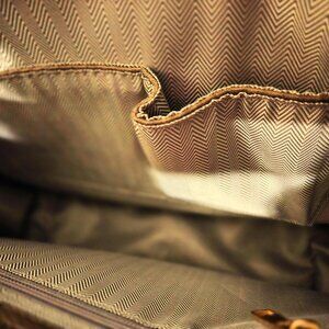 A zipper pocket on one side of interior with 2 slip in pockets on the other side of interior. Also comes with a storage bag. This is a great vacation bag as you can fit quite a bit in this bag and the zipper help make it secure.