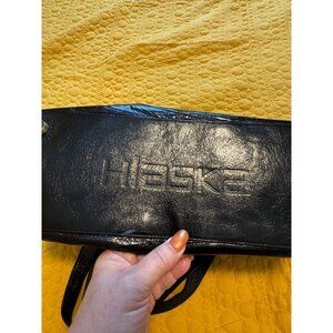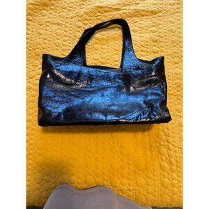 Elegant black leather tote featuring sturdy metal feet and practical zippered compartments.