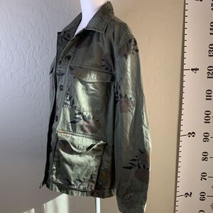 H&m green army style jacket w/ floral pattern. 4 front pockets & adj. waist