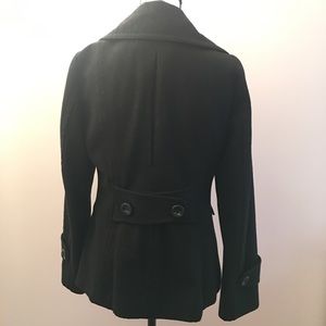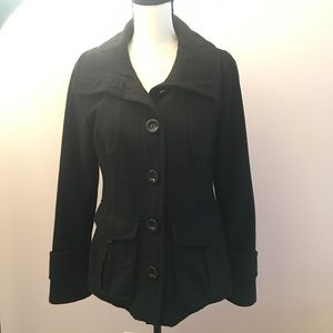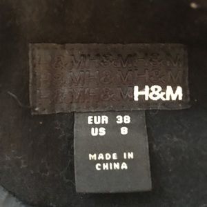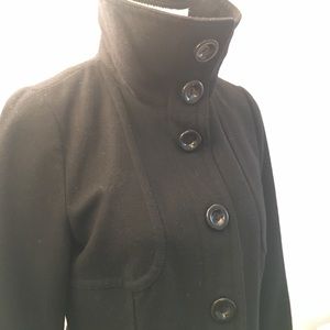Match with v necks for warmth, and you can turn down the turtleneck as well. Size 8 or size medium, has deep pockets fitting phones. Price reflects inside lining patched with blue squares as seen in photo. Obviously I wore this with everything as a transitional coat between fall and winter. Hm turtleneck wool coat jacket black