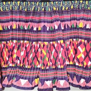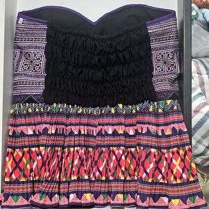 Vibrant strapless top with intricate patterns. Features a mix of purple, pink, and yellow hues. Stretch in back for comfortable wear.