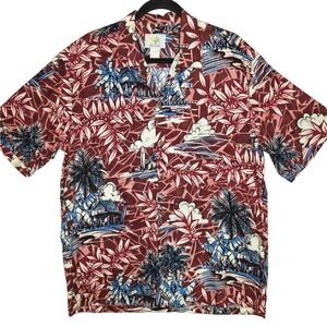 Ho Aloha Men's Hawaiian Shirt Rayon Large Surfboard House Palm Trees Burgundy Blue