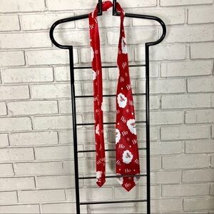This gently used festive holiday tie features a repeat pattern of the phrase "Ho ho ho" and images of Santa. 56 Inches long. 3.5 Inches wide right before the tip.