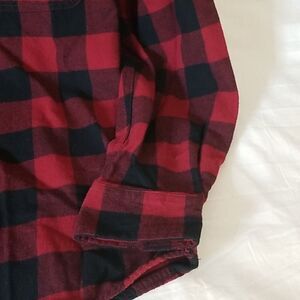 Classic red and black buffalo plaid button down shirt with a button down collar and double button sleeves! Extra buttons are sewn into the bottom. Perfect addition to any fall wardrobe!