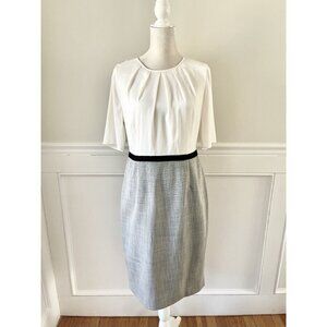 New with tags! The Adalyn dress by Hobbs London. US Size 8.Elegant sheath dress with a pleated white top, tailored grey skirt, and a chic black waistband. Ideal for professional or formal settings.